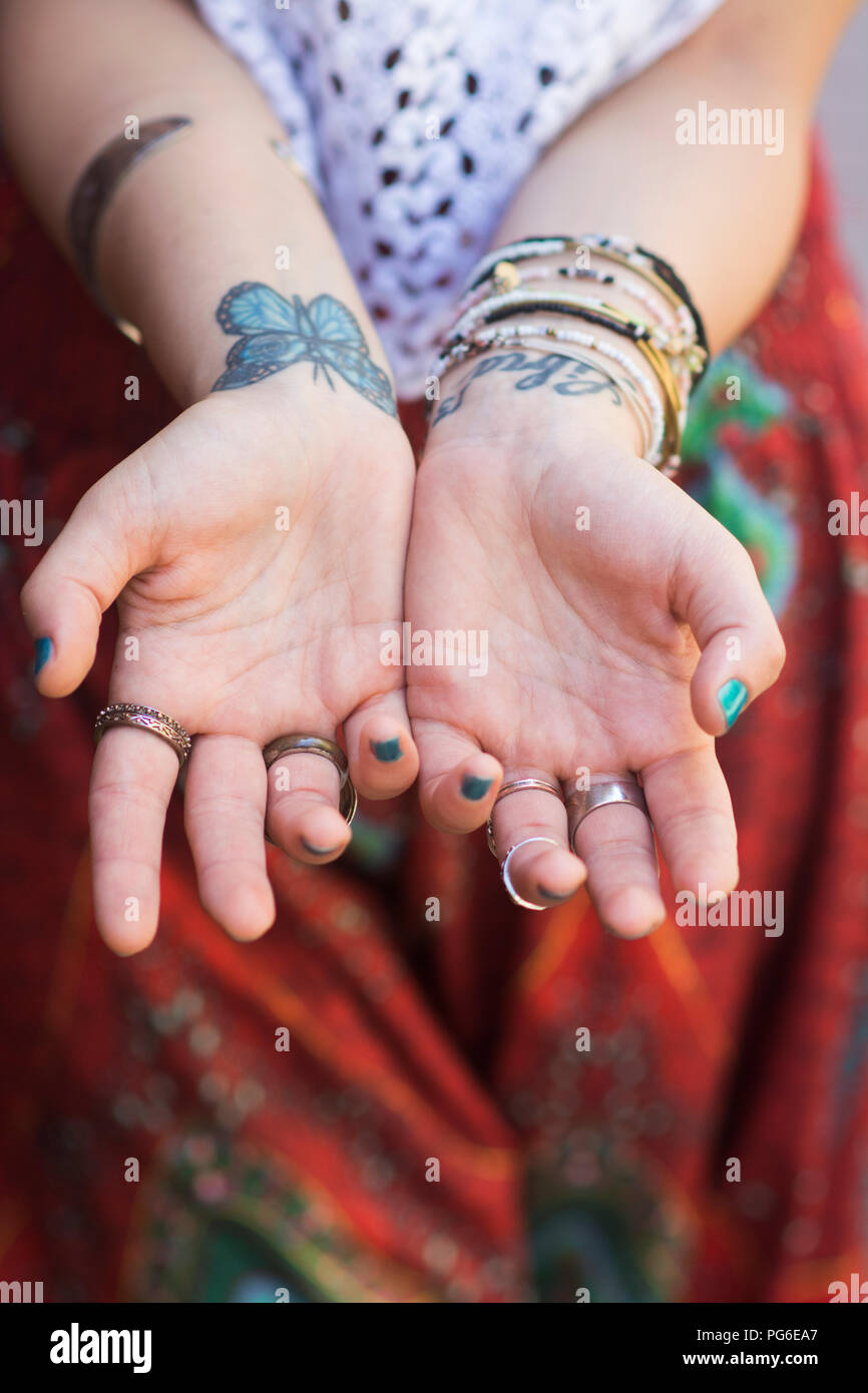Cerca De La Mano De Una Mujer Con Mariposas Tatuaje Fotografia De Stock Alamy