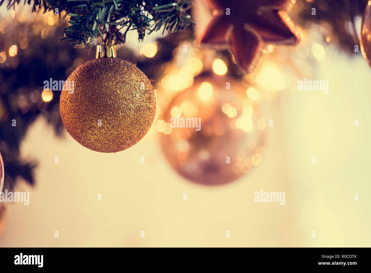 Albero di Natale decorato su sfocato, vini spumanti e fata sfondo, palle di natale decorazione Foto stock - Alamy
